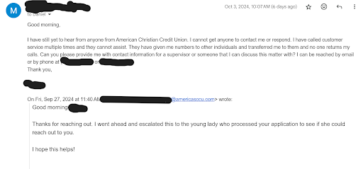 I did not know banking could be this bad. Customer service is horrible that it may as well be nonexistent. I have excellent credit and just got approved for a mortgage with another bank, and I was only applying for a checking account with them. I have never been denied a bank account in my life, yet somehow they denied me. I applied online and the person I was communicating with through their messaging portal asked me for additional information, which I provided. Then I heard nothing from them for about 9 days, so I logged back into the portal where I was communicating with the person (no name ever provided) and saw that I was denied. I was denied without any further communication. I sent another message in the portal inquiring about my application. They did not respond. I then reached out to customer service. They stated that they could not assist in the matter. They called another department and could not get a hold of anyone. They then offered to transfer me so I could leave a message. She stated Susan Long was the Relationship Manager. I I left a message and never heard from anyone. A week or more later, I got a letter in the mail. I was denied do to "unable to verify residence", though I provided my lease. I was also denied for "unable to verify identity" even though I provided my ID, social, date of birth. I was also denied for "Other, specify: required funds to open account not received." When exactly was I supposed to pay this? Usually you have to be approved for a bank account first then provide the $10 bucks or so to establish your account. The final reason was based on information obtained from a consumer credit agency. I know my credit is excellent so I have no idea what they are talking about. About four months ago before all of this, I was in contact with a Delivery Service Representative because I had inquired about an account. I decided to reach out to him. On 9/27 he said he escalated it to the lady who handled my application. 10/3 I emailed him again letting him know that no one reached out to me, and I requested a supervisor or anyone else that could help. I have not heard anything back yet and don't suspect I will. I am...