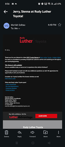 Most recently was there in January of 24 for a HYBRID System warning light(go to the source to fix a serious issue right?). They gave me a half dozen issues that could be causing it but wouldn't say what it was exactly gave me a lump sum price without a priority listing of which ones I should attack first. When I asked for a detailed listing of what items they thought needed fixing, They gave me a run around before giving it to me. It was a 3 hour + wait, and they didn't even offer me a true fix just "Some warning codes and what they might mean". Under week later I brought it to a trusted mechanic who had serviced it since the Tire rotation issue, and he said it was unsafe to drive because the back brake was seized open(unable to close), and the front breaks were almost failing. Something that Rudy Luther never told me about the state of the brakes despite being under the car for "Hours" not a week prior.