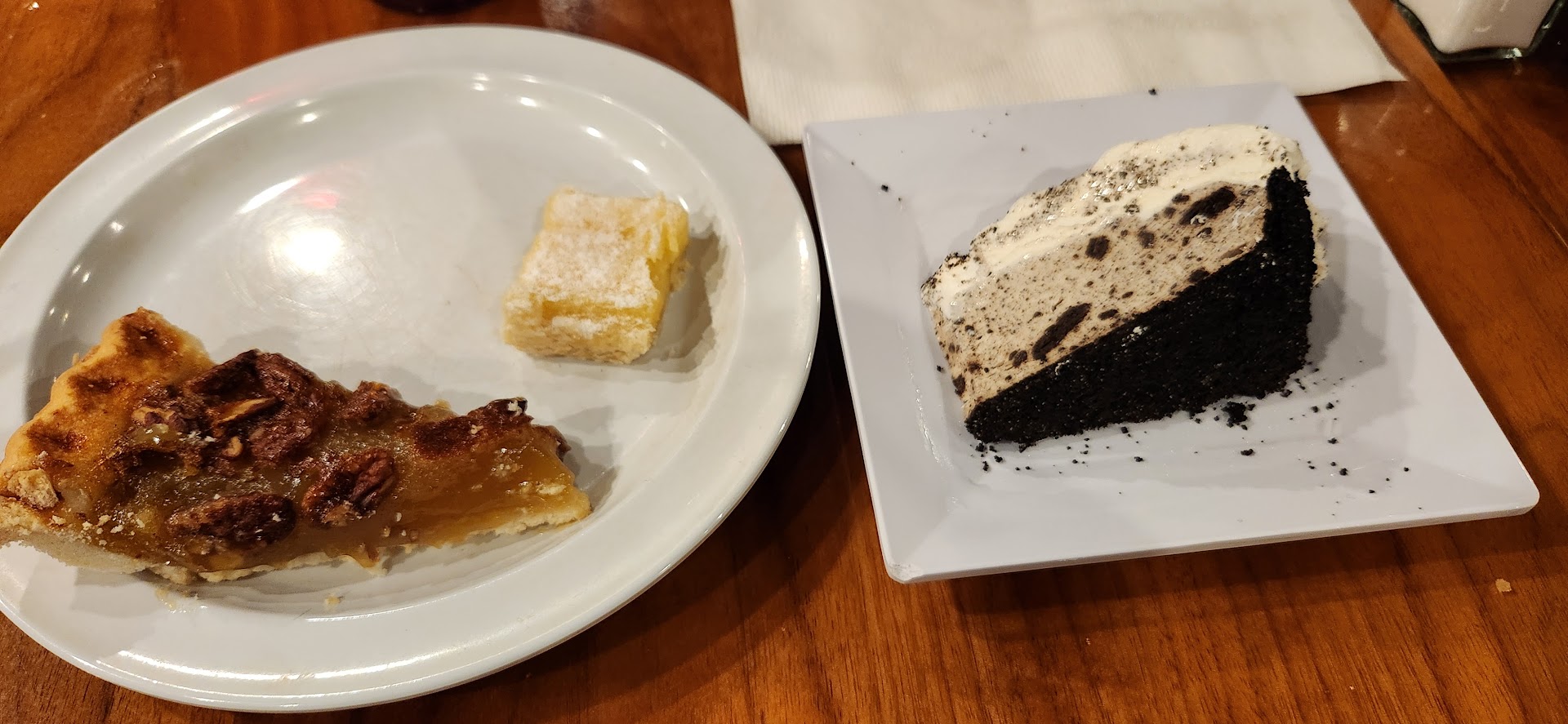 The desserts were ok. I had a lemon bar, and that was actually the best thing I had. The pecan pie was nothing but corn syrup and sugar. Barely any pecans. And then I had this oreo ice cream cake which was really good but it was definitely store bought.