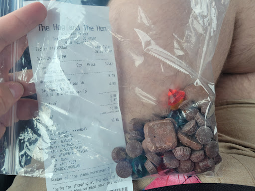 Read moreThe selection here is minimal at best, granted it does have quite a few imported and unique items, but the prices for said items ruin the whimsy of the experience. Also $15 per lb of candy is wildly unreasonable, especially considering how few things you have to pick from. This handful of mini PB cups and gummy gems was almost $5. The same price of a 10oz bag of prepackaged hard candy on the reverse wall.