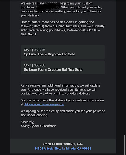 If youâre looking for furniture we definitely recommend Living Spaces. We would have recommended them just for our initial purchase but to see how they stood behind the product, responded quickly to our request and then helped us quickly resolve the problem was just excellent.