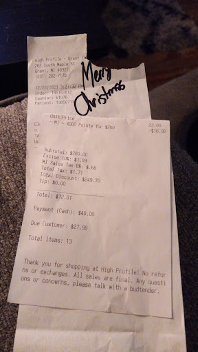 High Profile in Grant is legit. I have never been to any of the other High Profile locations so I cant speak for any of them besides the Grant location. There are a lot of dispensaries to choose from these days, most of them have good products, good deals and are clean & safe locations. High Profile in Grant has something that has become harder and harder to find these days for any business; An engaging, passionate and friendly staff. Ive been there twice now, both times the ladies at the front desk were very warm and friendly and easy to talk to and the two guys ive dealt with in the back part of the shop have also been very helpful and friendly. More often then not when you go into a dispensary they seem to just be trying to rush you in and out, you really feel like a "custy" in a lot of these places. Dispensaries closer to GR are a lot more busy and there is usually a big line, but both times Ive been to high profile in grant there was maybe one person in line ahead of me, and they got me in quick, but at the same time they took their time with me and showed me products i was curious about, even when i said i wasnt going to be buying certain products but was interested to see it, they pulled out multiple items for me and engaged in pleasant conversation that showed they know their stuff and are actually passionate about their work. ive been around the cannabis scene for 20 years and worked in the industry myself for a decade so i always hate when budtenders treat you like you are some noobie who doesnt even know what sativa and indica is, I never felt that here. I enjoyed every single interaction ive had there and it left an impression on me even after pulling out of the parking lot. i wish more businesses were like this, i wish going through our daily lives everyone was friendly and kind and made you feel welcome, but ill appreciate these interactions whenever they do happen. Props to this location, Its not enough to have good products when everyone else has good products as well, if a store could have Rizz, they got it here, and many businesses never find that. ill definitly stop in there whenever im...