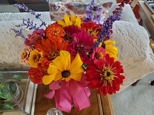 The owner of this nursery is an amazing human being, and her flowers are incredible. She has big hanging baskets of midnight purple petunias, and her dahlias are gorgeous, from midnight wine colors to red and white candy striped, which I've never seen before. The flowers are all as healthy as can be. The owner has decided to open up her cutting garden for this weekend, because of the firestorm 2020. She's letting the public cut from the cutting garden with rows of zinnias and dahlias, for free today on 9.12.20. I cut a bouquet and took them to my mother. What a ray of sunshine in an otherwise sad day. Thank...