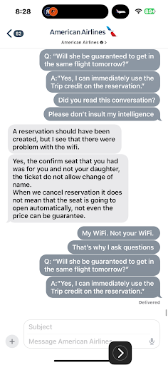 Read moreI am at a loss of words. While a weather condition caused many delays and then cancellations on 8/28 and the logistics nightmare is understood, the total lack of coordination within the airport by AA cs ground teams is unspeakable. Updates to passengers were slow, cancellations were so slow it was chaos and too late to enable passengers to make other accommodations. Passengers were in a 2-4hr line to get help. While I managed to rebook via online chat agent for a flight 3 days later, my checked bag was not as lucky. Standing in a 2nd line for another 2.5 hrs to ask them to please re-associate my luggage tag with my new flight (as I was urged to do 3 times by the AA booking agent and communications). The extremely frustrated cs rep told me I can NOT get my bag (ok...it's SOMEWHERE in a huge luggage system...I get it) and it will go to the original destination on the next flight (which would be a few hours later). A flight I would not be able to be on. Online check in is only available 24hrs pre-flight (2 days away for me), the self check-in kiosk is closed (as it is 2am at this point). I am 2 hrs from the airport and am expected to stay at airport for 4 more hrs until check-in opens? Or drive 2 hrs each way JUST so I can check in to my flight 2 days early so my bag tag could be updated? That makes zero sense. At this point my luggage is indeed on an early flight to my original destination and no one there will have a clue why I have not picked up my bag and the bag tag will not reflect my new flight information. AA has no method for me to advise that AA airport ground team of my extremely late arrival....if they attempt to deliver it to my destination address, I won't be there to accept it. So now I'm spending another 1+ hrs trying to find someone who can at least slap a note on my luggage that I will arrive in 2 days to pick it up. I have been on hold for 45min to the first number, to be told I have the wrong dept and they need to transfer me. I am now on hold in yet again a 2nd hold line (estate 50min). There are sooo many opportunities to prevent this along the way. Weather happens...but why does this airport ground team simply have so little preparation???? This is an AA hub...and the baggage handling has continuously been simply atrocious. If I did not have items that can't travel via carry on, I would avoid checking bags to/from this specific airport location at all costs. It's just not working even on a good and normal day...and weather happens often and regularly. Automated chat (though I'm an avid fan/user) does NOT fill this...