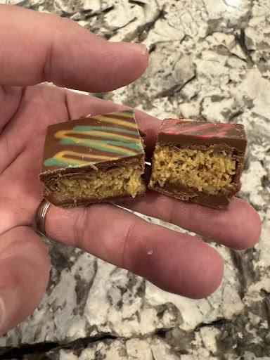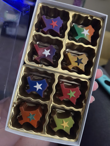 This little chocolate shop is tucked away off historic Main St Grapevine! Came for the Dubai chocolate bar, left with much more! I (like lots of folks) have been interested in and finding this trending specialty chocolate. And then found the Tx shaped truffles so had to grab some! She wrote what flavors I got on the box (THANK YOU!) and I know I would never remember once I got home. Painted moulds help to identify but I still don't remember which is which. Ah, Gump, here's my box of chocolate. I kinda know what to expect but I'm still gonna be a bit surprised. I've just had one so far and YUM! (It takes me time to eat sweets) And since it was a hot day (hello mid-summer Texas) she popped a small ice pack in my bag. She also included a free "sample" which was pretty much a full on...