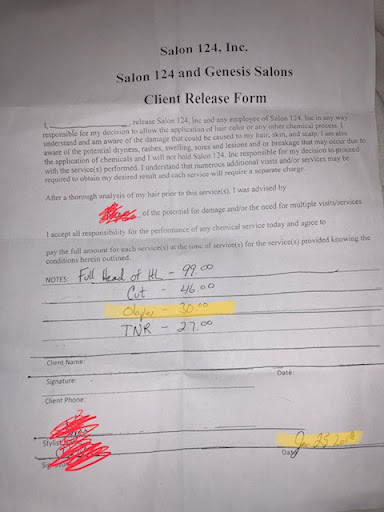After some consideration I have decided to post a review so hopefully this will not happen again to someone else. Sadly, my experience here was disappointing. I called and made an appointment for a consultation and met with a stylist who will not be named- I 'm not directly blaming her entirely because in my experience with Genesis and Salon 124 this is a company wide problem and not just one stylist. She was nice and friendly and we began discussing my hair. Simply put, I wanted a color correction. I walked in with a darkish brown hair color that I wanted corrected to my natural, light brown. After she was done I canât say Iâm 100% satisfied but with the route she chose, my hair does not look bad, just not really what I wanted. However I am more upset about her/the company lying about a service offered. I googled (as shown in the pictures below) salons near me that offer the service of OLAPLEX. For those who do not know, Olaplex is a special treatment for color processes that protects the hair shaft during coloring. The ONLY REASON why I even made this consultation appointment in the first place was because their salon came up on the list. I understand that sometimes google is wrong, but that is not the problem. After asking my stylist about Olaplex, she happily agreed to do the treatment (obviously implying that they had it) she occasionally referred to it when she was washing my hair. I know Olaplex is a unique brand, I know it is a three step process-the third step being a purchasable item that the client can buy and use at home- and I know what the bottles look like (I've had it used on my hair before with a different stylist in Atlanta 2 yrs ago). I know the look, shape, feel and even the smell on my hair. When my stylist at 124 took me to wash my hair she grabbed something called "Keune Bond Fusion". Long story short, instead of telling me that they did not offer Olaplex, she lied to me about it and used an entirely different product and charged me for it too. This experience was just really sad and a let down. I wouldnât have come to this salon had I known they donât actually have the product. This has exemplified to me a poor representation of the whole company. I wonât...