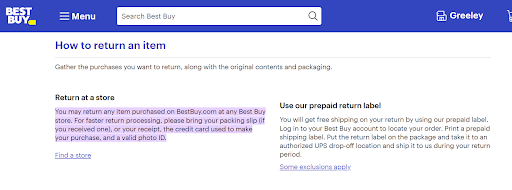 In sum, the manager at the Best Buy store in Greeley was rude and inflexible and put me in a no-win situation by not allowing me to leave this TV at the store even though the website told me to take it there (see picture). Further, the website says you can take ANY online purchased item to the store for a return. This is a lie and a deceptive practice. I agree Best Buy can be great when you are in a pinch, but their customer service is the worst I have ever experienced bar none. Better to pay more and buy from a place that honors their stated return policy and does not give you an hours long run around on the phone for...