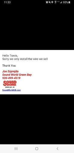 Read moreThese guys are amazing!!! Experienced, professional, and empathetic!!! I earlier today had a bad experience at one of their competitors. I had scheduled an appointment with a competitor to get my car speakers replaced. I had scheduled the appointment after waiting two weeks for a Saturday appointment. They said it would take two hours. I come back about 30 minutes before it is supposed to be completed and they hadn't even started installing the speakers. They said they had been busy, which was true, but then why did I schedule appointment? Anyway, I told them I had to leave for an errand and saw Sound World. Seeing as how busy the other place was I figured I would just schedule an appointment for a different week at Sound World. I told them what happened and they were very understanding. They also seemed very knowledgeable and knew what speakers I needed. They were busy too, but after hearing my plight they said they would work me in instead of making me wait another couple of weeks. They got right to it and installed my speakers the same day and they sound great!!! It ended up being a little more expensive, but well worth it. I highly recommend these guys over other area...