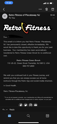 If you read the bottom of the email about the transfer it says if you did not request a transfer then your membership will automatically be canceled. So first they send an email saying that they’re going to cancel everyone’s membership that was from Piscataway and then they sent an email an hour later saying that they transferred my membership, but I never requested a transfer and when I called to inquire about it the staff member said she doesn’t know the ins and outs of what’s going on, but that they’re transferring everyone From Piscataway to Greenbrook which is against everything they have in their email and in their fine print.