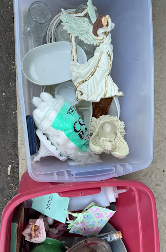 Some books, dvds, vhs tapes, lamps, wall art, pillows, plates, cups, washer/dryer (needs repair), fridge (needs repair), toilet and some more miscellaneous items.