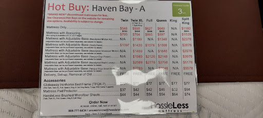 Read moreI purchased my order online from the comfort of my home. I am a guardian for a ward of the state, prior to the order I placed for my ward, he was sleeping on a futon mattress so anything above that was a great value. I looked at the hassleless website and I was pleasantly surprised. It was VERY basic, easy to follow, no ads, and placing the order was simple. I didn't feel the need to go to the store as anything above a futon grade would be an improvement. The brand names that were able to be chosen were all familiar to me and the website revealed how firm the choices were. Very easy to select. Plus for my ward, we had to stay within a certain dollar value and choosing which would be best was easy. The delivery was made to the group home without issue and they removed his old futon. My ward is very pleased with his new bed, is sleeping better, and I was very pleased with the service. I was supposed to get a delivery time range phone call the day before but I never did, so I emailed Weston and he responded within an hour and gave me a timetable....