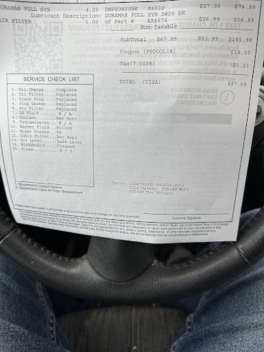 Read moreI gave this a four overall because there was only one young man working on my car that needed an oil change. He was very very good and in fact deserves a HUGE raise as he took very good care of what I needed. Very knowledgeable and helpful. I felt sort of bad for him that his other co worker was outside asleep in his car when I drove up at first. This young man tried to go wake him up several times to no avail and by the time I left he decided smoking pot was much more preferable sitting in his car than helping his poor co worker out who had two customers come up after I was already sitting there. Absolutely unbelievable! Lucky for this young man I wasnât in too much of a hurry or I would have been really upset. But I donât feel like any of what happened was this young manâs fault and that other guy whoever he is should be fired for showing up an hour late just to be sleeping in his car and then smoke pot to boot. Hope he wasnât on the damn clock. So your other worker deserves a raise and a promotion for what he has to put up with. Just felt sorry for...