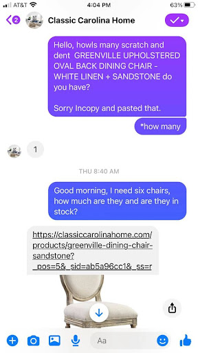 Read moreI DO NOT recommend. See update at the bottom. Worst customer service. Asked for a quote on 6 chairs, they give me the link to their website. I tell them I've seen the website, can you give me a quote for the 6 chairs with delivery. They say 6 x $299 plus delivery. I asked why is it so hard to get a quote from you guys? As a customer I shouldn't have to do my own quote. Most furniture places will even try to sell you an extra warranty, but, no, I can't even get the full quote. I told them, we can't come to the showroom due to Covid so they'd be a little more helpful, but no. In their message to me they finally lay it out about the delivery fee, delivery is TWO HUNDRED DOLLARS for a 6 mile drive and 6 chairs. Then they say they need additional information and if you're located in SC that state tax would apply. They ended by asking where I lived (after I already told them), so, I respond and my message wouldn't send. So, I check on FB and they blocked me after asking where I lived! All I needed was quote, and they didn't want to bother doing the work. They did as little as possible and got an attitude when I expected a little more effort on their part. It's like pulling teeth to get a proper quote. Rude, just really, really rude. I won't ever shop here. Ever. By the way I NEVER did get the quote. Way to go, you guys just lost over TWO GRAND or is it a little more, I don't know, not my job to do your math. Facebook customers are REAL customers, never treat them like they're a waste of your time. PS I sent you guys a photo of my farm style table, like the one you had in your ad, the one that matches the chairs, I am a real customer, needing real assistance and you failed. Hope you treat all inquiries in future like REAL customers in the future. As far as I'm concerned, I wouldn't even give you one star.