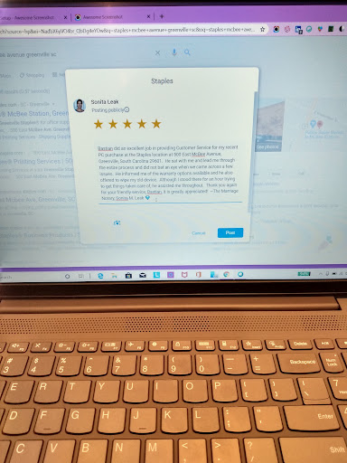 Read moreRarely leave reviews but had to give a HUGE thank you to two gentlemen who were working at the tech counter on the afternoon of 12/10/20. I was in a scramble as I was preparing for a very important slideshow (for my sister's already once postponed rehearsal dinner to be exact). I was down to the wire and finished the presentation only to find the computer onsite was not chrome cast enabled, nor would dropbox/GoogleDrive import it to share as it was such a huge file needing HOURS to upload. Long story short, these guys answered the phone as I rushed over in my vehicle, had the special Mac to Windows memory stick ready for me that I needed, made sure the file had transferred from my laptop onto the memory stick, AND added a program that I would never have known I needed onto the drive to make sure I could play the file on an older laptop back at the dinner. All in all THANK YOU! I was frantic and almost in tears wanting my sister and bro in-law's evening to be special despite all of the changes and postponements they had been through/the continued COVID precautions we observed, and Staples gentlemen you were the MVPs and went...