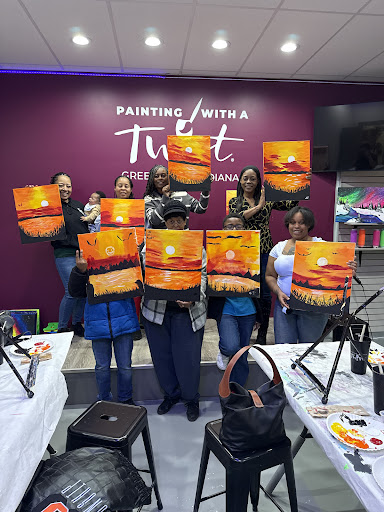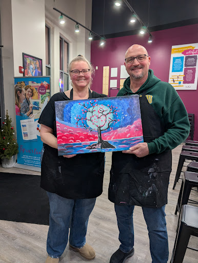 Read moreLet me first say this was an amazing experience! Me and my fiancé were running late and arrived right at the start time and were not rushed. I originally found the same piece I wanted to surprise my fiancé with at the Carmel location and they didn’t have availability, looked at the greenwood location and they did. I was in contact with the owner and let them know this was the first date night we have had since our son was born, and they made the experience even sweeter by having me my fiancés seats on the left ( you can see in my photo). We were greeted by Christian and he was very kind, helpful and knowledgeable. Addison was the other instructor there and she was above and beyond helpful, and made this experience the best if could have been for us. I asked if we would be able to make a candle to take home even though we were running late and she didn’t hesitate to help us out with that, not only were we able to take our art home with us, we also got to make a fantastic smelling candle with just made the experience sweeter. Christian and Addison both would help when we felt lost, complimented how our pieces were coming along and were present. Not like other classes where an instructor doesn’t wait for you and you feel rushed, YOU WILL NOT FEEL RUSHED I GUARANTEE THIS! Also I do recommend getting there early so you can see all the unique pieces of art displayed, grab a drink/ snack, and if you get a chance definitely make a candle! This is the first of many experiences we...