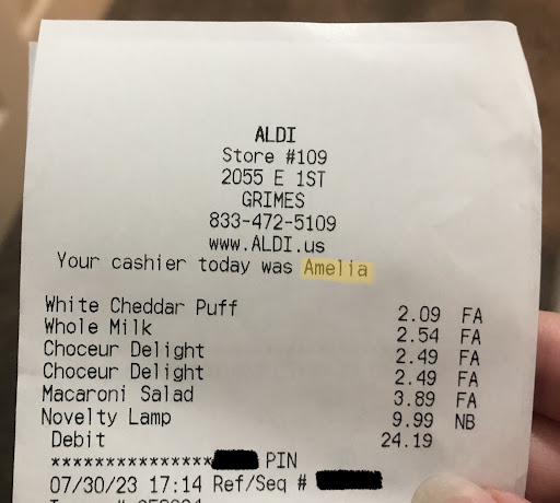 I love Aldi & you definitely get the most bang for your buck & some of the best customer service here. However, today at the Grimes location the cashier named Amelia (got her name off the receipt) was exceptionally rude. I had my 1yr old son with me and when we went to check out she started ringing things up then I asked her (politely) if we could use the cart we currently were using because I didnât want to have to move my son & hold up the line. She said âFine.â then pushed the empty cart away and grabbed the back of my cart and swung it around while my son was in it. That irritated me but I was going to let it go.