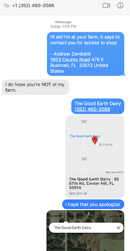 Do not trust Cid the owner or her website! SHE IS FACTORY FARMING HER COWS. INHUMANE TREATMENT LIKE ALL OTHER BIG AG! She is not a member of the raw milk community and is completely out of her mind. Cussed me out for trying to buy milk from her because I went to her farm... apparently thats a big NO NO to her even though google listed them as an open store front for business. The attached screenshot was before an unbelievably rude and psychotic phone call where she yelled at me and denied me access to buy her milk for accidentally not knowing I was supposed to buy online and that google was incorrect in that its not an open storefront. The reason being is that she is hiding a factory farm! The raw milk community is friendly, loving, and inviting. Do not support her. She is the enemy we are fighting against! I will be filing a report to shut her down for false advertisement or any...