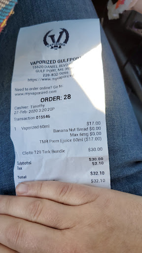 Read moreVaporized Gulfport is where it's at! I went in today, completely clueless and walked out with not only exactly what I wanted but a wealth of knowledge thanks to chance! They were so accommodating in teaching me about what benefits/goals I was aiming for and how to successfully ween off cigarettes/over time quit. I had tried a Hyde banana from a friend who bought theirs at the same store and I liked it. I asked about it but they didn't have that flavor. Its okay though bc there were countless others! I wasn't even sure the Hyde was the way to go either bc of the nicotine content but given that I was smoking a pack of day, this was a good substitute to get me comfortable and familiar. Chance said when mines done to come back and they'll help with juices, adjustments, and get me to a point where I'm just doing vapor which is what I want. Please go see these wonderful folk! They also offer 10% military/ first responders on select items. I look forward to...
