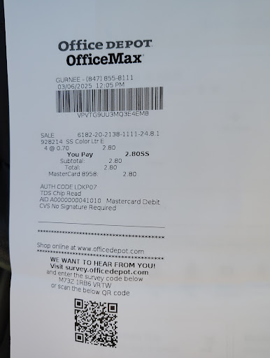 Read moreThis afternoon I went to Office Depot In Gurnee and was warmly greeted by Eric. He offered to help and because I was ready to buy 1000's of dollars in merchandise for charity, he suggested some options that might work best for buying in bulk. He was kind thoughtful and willing to help. (you know, great customer service which is rare these days)
