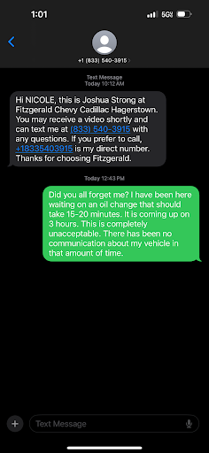 Read moreThis review applies to the service departments at Fitzgerald Jeep and Chevrolet respectfully. It regards my most recent visits to these dealership service departments and pertains to my Maryland State vehicle inspection. As a new resident of the state of Maryland, registration of my vehicle has proven to be as difficult as I could have imagined. Due to my work traveling I have had my 2019 Jeep Renegade Trailhawk serviced in Jeep dealerships in 10 different states since buying it. So, I have seen the good and the bad concerning Jeep serviced departments across the USA. Oil changes on this model can be done independently for those mechanically inclined, but due to the steel plate covering the entire underside of the vehicle, can prove to be a messy undertaking. Hence, taking my Jeep to the dealership for a $100 oil change is worth my time. While having my Jeep serviced at Fitzgerald Jeep in Hagerstown, MD I paid $130 to have a licensed inspector, employed by Fitzgerald, do my State inspection. It feels like a service that a decent dealership should provide and I was not disappointed, initially... After changing the oil and completing the inspection I was told the third rear taillight was not functioning and I would fail my inspection because of that. They provided a video of the problem on my vehicle with the technician showing the issue. I was quoted a repair of over $400.00 USD and no guarantee that the problem would be fixed. "It might be a wiring issue, but we won't know until we replace the light." They charge $175.00/hr labor and the price quoted for the taillight was $248.00. I was additionally given the option to have the taillight repaired and bring the vehicle back within 30 days to pass my inspection. I chose to repair the taillight myself, which I did, at a cost of $30.00 USD. It took me 30 minutes. I contacted Fitzgerald Jeep service department and was informed that the state inspector no longer worked in that service department, but they would have the inspection completed by their sister department at Fitzgerald Chevrolet. I made my appointment and had my inspection done there, only to be told that while the taillight passed inspection, there was "too much play in my sway bar end links." Now, we own a GMC Acadia, which passed inspection at a local garage after we had to replace a rear seatbelt. Luckily we did not bring that vehicle to Fitzgerald. There is clearly a pattern emerging with passing a Maryland State vehicle inspection in Hagerstown and it involves how much money you are willing to part with. I know enough about vehicle upkeep and maintenance to know when I am being nickeled and dimed. This dealership wasted my time and took my money. They chose to try and squeeze me for a quick buck, rather than gain a lifetime customer. Do not trust Fitzgerald Jeep/Chevrolet, they do not deserve you business. If this is the "Fitzway", I think I will take a different route. Thank you to the service department and Jack Fitzgerald family for ensuring we never buy a vehicle nor have our existing vehicles serviced at Fitzgerald Automotive in...