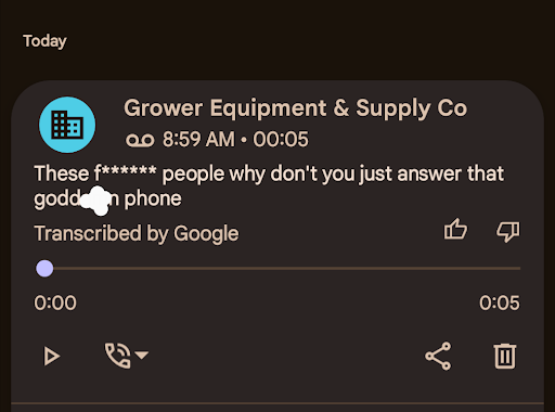 Here is where the issue begins. Once the call was completed, I get a notification that a voicemail was left by the guy at Grower. The voicemail I received was vulgar and completely unprofessional. I will provide a photo of the transcription by Google.