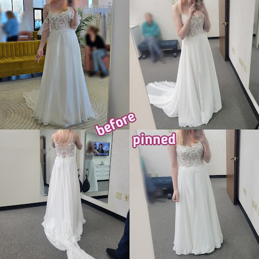 Read moreOverall, I had a really good experience ☺️ The woman who worked with me was very kind and my dress turned out exactly how I wanted. I needed the train cut off and wasn't a fan of the way my slit sat, but my dress fit me perfectly otherwise. She was very informative, letting me know that I may end up with a ripple in my skirt if I adjusted the slit (which I said I didn't mind) and warned me that if I get my dress dry cleaned beforehand (my dress was the floor model) to let them know I still had yet to get married, to ensure they wouldn't accidentally shrink it or something. She didn't try to talk me into anything or upsell me, provided helpful advice, and was able to make it into the dress of my dreams just in time for me to get married to my love 🥰 If I had to mention the few things that could've been better, my skirt did have some long strings hanging where it had been hemmed that needed to be trimmed, as well as a pin still attached. My few alterations were also more expensive than the dress itself, but I'll admit, I didn't get any other quotes - it was probably standard pricing (just shocked me a bit). Thank...