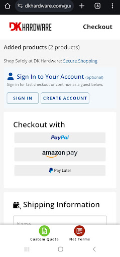 DK Hardware's shady business practices don't end at a bait and switch. I paid for my order with PayPal. I just wanted to check out as "guest," as they advertise on their website (see included photo). I never created an account. I simply paid with PayPal, and all of a sudden I got an email saying that an account was created for me. They provided me with a random password and my username is my email address. While I was on the phone with their representative handling their bait and switch, I requested that she close my account. This is when she told me that she cannot close my account and that they open accounts automatically for tracking customer orders. Okay. So, then why are they advertising checking out as guest? Really shady stuff. So now, they have all of my personal details in their database, and I don't know what they plan on doing with it.