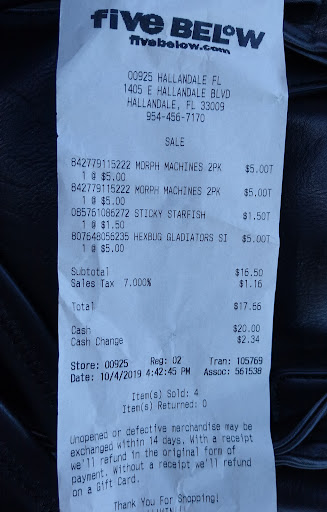 Read moreFive below is a little gem. Loved it. My son loved it as well. There are so many variety to choose from whether it is cosmetics to slippers, to clothes, home, school supplies, toys, I can keep on going. And all for $5.00 or less. Yes, it is true. Everything at this store is $5.00 or less. Associates were all very kind from the minute you enter the store, you are greeted with a nice "welcome" and a smile. 😊 By the way, as soon as you enter to your right, there are some really good items for Halloween. You will find Halloween masks to hoodies, and t-shirts, decorations, so many cool things for adults and children. Oh, and for you pet lovers, they have cute stuff for your pet. From outfits to toys, and some. And for you readers, they have interesting books for adults and children as well. Five Below, in my opinion, is definitely...