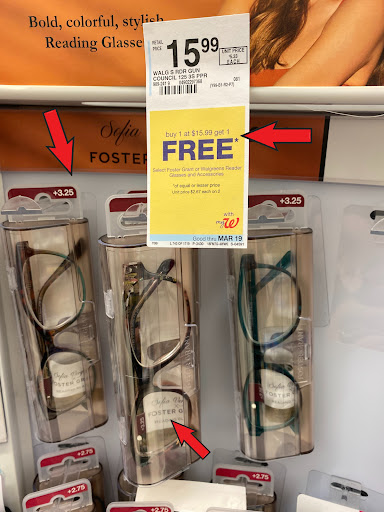 Ā Ā Ā Read moreI don't recommend anyone shop at this location, due to their bait and switch practices. We attempted to buy two pair of Foster Grant reading glasses at the advertised $15.99 ea. BOGO price, that was listed on the display rack. The BOGO deal was advertised to be good thru March 19th (today is only the 14th). When they rang the glasses up on the register, the price per set came to $29.99 ea. (instead of the $15.99 ea. advertised price). When we protested, the manage on duty "Dwight" walked over to the display case with us to verify the price, and he said "this price is only on Walgreen's models and that the special price was no longer in effect anyway.'' Again, we pointed out that the price clearly states "$15.99 on both the Foster Grant brand and/or Walgreens Reader brand, and that the BOGO offer also stated "Good thru MAR 19" Dwight (the manager) still stuck to his story, despite us showing him again where it clearly says Foster Grant brand included and also that the price marked was good until March 19th. "Dwight" also didn't remove the promo pricing sticker from the display, even though he just said it was not correct. Now other shoppers may be misled into believing the price is $15.99 per pair; unfortunately some shoppers won't notice when their items get rung up, and others won't have the courage to dispute the higher price, so they'll simply fall victim to getting ripped off. I have included supporting pics; you be...