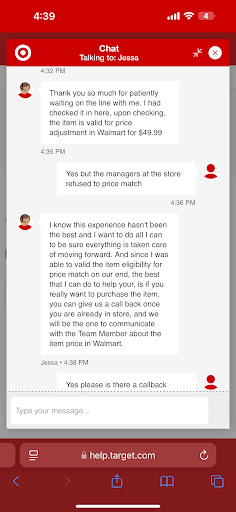 Read moreWe came in to your store specifically to buy a Swiffer Sweeper Vac due to the fact I had a manufacturer's coupon from Swiffer since mine had malfunctioned. The coupon had been mailed directly to me from Swiffer via the United States Postal Service. The store did not have one on the floor, although the Target app showed several were actually in stock. We finally found a young lady associate named Ashley to help us. After about 30 minutes, she finally located one in the back. Upon entering the check out lines, we noticed that only the self check out lanes were open. We waited in line for self check out and rang up our items. Upon trying to scan the coupon for the free vacuum, we came to find out that the coupon would not scan. We waited several minutes for an associate to help us. He said he could not authorize the coupon and called a manager over. She would not honor it either and stated that it had to have a gold star on the coupon. She then proceeded to call over another manager by the name of Curtis who would not accept the coupon either. I called Swiffer after I left Target and they stated they do not put gold stickers on their coupons and that they have had a multitude of feedback from consumers who have had issues using their coupons on products at Target. We immediately went to a local Walmart store and used the coupon/certificate with no problems. I have contacted Target 3 times regarding the issue. The first two times, the call was "dropped" after I was put on hold to investigate the issue further. The first associate was named Chris (female) and the second was named Emily. The third and final time I spoke to a manager named Christine, who promised she would get back to me, as of today I have not received...