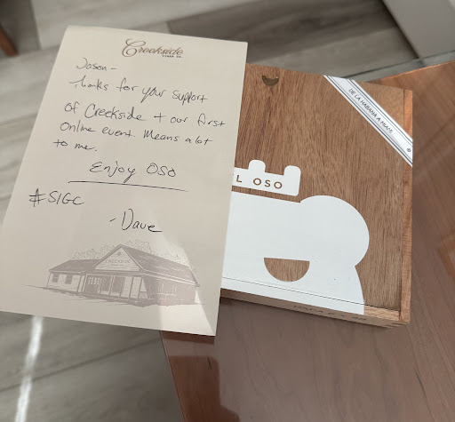 Ā Ā Ā Read moreSo was my first trip to Creekside, soon as you open your vehicle door you smell the beautiful smell of CIGARS, Knew immediately I was gonna love this place. Upon entering a friendly gentleman (sorry didnāt get his name š) welcomed me in showed me into the Humidor and made a couple suggestions and then Just let me browse with no pressure, I selected a La Flora Dominica, paid and joined my buddies on a comfortable couch, the gentleman then brought over a carafe of water and glass, to cleanse your palate l, a very nice touch. Staff was friendly, atmosphere was relaxed, big screen TVs comfy couches, and an outdoor porch to sit and enjoy nature, they also have couple roll up garage doors to combine indoor outdoor, I brought a Baja Blast with me but appears they sell soda ( or pop depending on location ha) Prices where fair, they have a members area but donāt know anything about it. Although itās a bit of a drive, by far one of the best Cigar Lounges Iāve been too! Definitely a MUST Visit for any Cigar smoker, whether youāre an Aficionado or a newbie check out Creekside Cigar Co I DEFINITELY WILL RETURN THANK YOU...