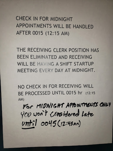 Read moreContrary to the reviews I found my visit very pleasant. Arrived at 2330 for a midnight appointment. Called the number on the gate to get in. Go right ahead and back into doors 19-29 for frozen load. Break your seal open doors slide your tandems to the rear and back right in. Once set walk paperwork into receiving office let them know your phone number and what door you have. 30 min later I was unloaded and paperwork in hand. Wasn’t a cluster F of trucks here even on a weekday night. Only big down fall is they have no parking at all. Once unloaded you have to leave. And the truck stops are packed 24/7 in this...