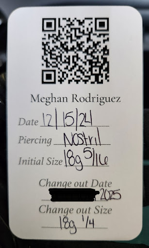 At the end of the service, she provided an info card with her personal Instagram, the date, jewelry size, my two-month downsize date, and the recommended size to downsize to (no printed aftercare instructions). While this was helpful, it didn’t make up for the lack of guidance during the actual appointment.