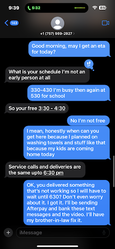 Wish i could give half a star or zero stars. DO NOT BUY ANYTHING FROM THEM. Bought a 5 appliance package for $1500. Fridge, dishwasher, stove, washer and dryer. Dishwasher constantly drained and never held water. Called and he brought out a replacement. Left the other dishwasher for me to dispose of. That’s fine wasnt mad. Next issue, the Fridge icemaker wasn’t working. Called and was told i can’t expect everything to work as described based on what i paid. Can’t expect it to work like new. Told him i dont expect it to work like new but i expect it to work. Especially since u offered a 6 month warranty. He then told me he would be out to fix it, but on his own time and he didn’t want anyone standing around him when he fixes it. Needless to say he never came out. VERY UNPROFESSIONAL AND RUDE!!! Also the dryer is as missing a foot when installed and he told me, i quote “you have rental properties and you can’t balance a dryer” to which i responded “you sell and install dryers and u can’t balance a dryer”. Anyways he blocked my number and avoided messages after that. HES ABSOLUTELY THE WORST. Oh and if he disputes this i have the receipts....