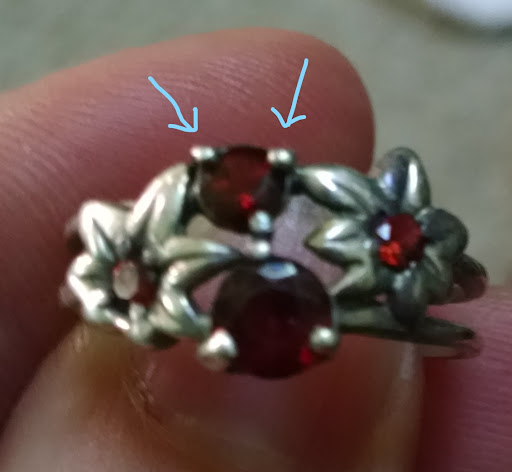 In the pictures, the first is a before of the face of the ring with the arrows pointing to the two pins needing repair. The second is "after" the "repair" and the mashed metal of all 3 pins. The third is after the "repair" and with a super close up you can actually see that the pins are gapped and turned up. One is a pin they "repaired" and the other is the one pin that didn't need any work. Sadly the ring came back in much worse shape than when I left it there. The only positive thing I can say is that the stone isn't...