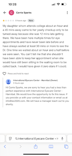 Read moreHad an appointment scheduled weeks in advance. Confirmed via text message only to arrive and be told the appointment was cancelled because I didn't confirm via phone call (they left a message and I didn't call back) assuming the text confirmation would be enough. The secretary told me there was no appointment scheduled under my daughter's name and on closer inspection told me there had been but it had been cancelled. She then proceeded to tell me my daughter had previously seen the other eye doctor at that particular facility so we should have scheduled an appointment with him anyway. I informed her that my daughter was in foster care and I had never brought her to this location before so if a previous foster parent had brought her, how in the world would I know that? If it matters enough to IEC to make sure kids see the same provider every time, they need to be more diligent about looking in to records beforehand. I also very much resented the fact that I had to announce to her and other literal strangers that my teen daughter is a foster child. My child didn't deserve that. Furthermore, we drove 40 miles to get to our appointment. If IEC can email me, text me and call me to confirm every appointment, I sure wish they would also inform that my appointment with them was cancelled. We will be going...