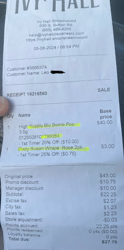 Ā Ā Ā Read moreI have always felt very awkward in dispensaries, or really anywhere. But today, that changed when I walked in here. I didnāt catch everyoneās names, but the front desk employee and security guard on 05/08 around 6pm were very kind, along with Flo and Destiny! Flo was very very kind to me, Iāll never forget them. My name is different than the one on my ID, and without hesitation, Flo asked everything needed in order to help me feel accommodated. I was really thankful for our discussion even before discussing products, it genuinely made me feel safer than I ever have anywhere in my life. Along with that, Flo really helped me with picking the best products for my budget, and showed me their favorites in great price range. They showed me the price before I was going to pick my wraps in case something was out of my budget, which I thought was really cool. I was buying for my girlfriend, and Flo asked me what she was like so I could buy the best wraps for her. We picked out these rose pedal ones, and Flo even researched the product since I had a few questions about them as well. The total was $43, before any discounts. 25% on everything for a first time buyer, and along with their discount wheel, I got very lucky and received $10 off my order as well. So something that was $43 now became $27 all through being a customer! And the next time I come in, I will also get 20% off. I HIGHLY recommend this place, not only for the prices, but genuinely the service was amazing. Literally everyone I spoke to was kind (and complimented my outfit!!) I