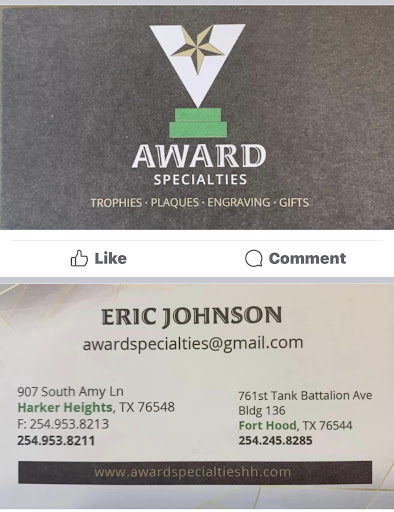 We bought a filet knife for a dear friend that loves fishing. We had it engraved with his name and planned on giving it to him on his birthday. When I typed his name in, auto spell changed his name and I didn't catch the error. We received the knife and just then noticed the error. I made 2 calls to companies in Killeen that specializes in engraving. The first company didn't have a clue as to how to correct the engraving so I made a second call to AWARD SPECIALTIES. I spoke with Erin and described our dilemma. Erin immediately knew what I was trying to describe, asked a few questions and told me that it wouldn't be much of a problem to resolve. Erin quoted me an estimate and said it would be about 3 days to repair. We brought the knife in on a Monday and Tuesday morning Erin called to let us know it was ready. Erin made every effort to make the correction as soon as possible so we could get it to our friend for his Birthday. Erin not only rushed the repairs, but charged $10.00 less than her estimate. Erin and her company are the absolute best and will go out of their way to complete any project on time, or earlier than estimated. The quality of their work is impeccable and Erin will do everything she can to ensure your project is completed in a timely manner and at the best price possible. Don't look anywhere else.....if you need something done....go...