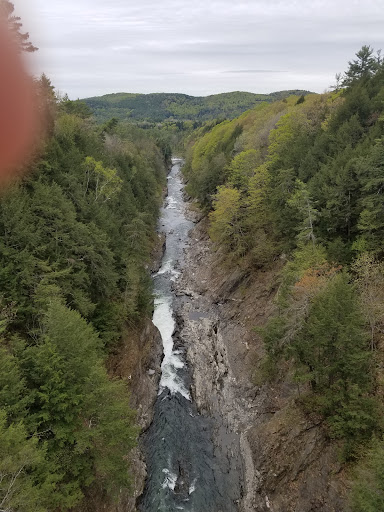 If you like to hike through forests laden with fern, old pine trees, gigantic boulders misplaced via ancient glaciation and trails probably made 400 years ago you'll really enjoy the hike from 'street' level down into the gorge itself where view of the spanning bridge and towering, rocky forest makes you feel like a small point but still connected to this great and beautiful planet of ours. Additionally, once down in the gorge if you like the stories that can be told about the changing geological processes look down at the dark gray slate bedrock worn smooth from the weight of moving ice sheets. Notice the perfect round holes situated in this same gorge bedrock: The after-effect of a glaciation process termed 'plucking'. I'll let you look that up. A visit to Quechee Gorge is well worth time and trouble. Great antique consortium on the nearby...