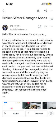Read moreVery bad experience, came in a rush to buy shoes for my event so I didn’t look at them well when I was sold damaged heels with water damage and the heels are talking back to me when I haven’t even got to wear them yet. I didn’t realize the product was old and now the manager is saying she can’t refund even though this was sold to me just like this. It’s a...