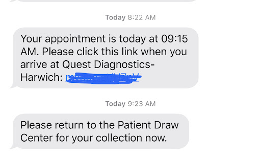 Make an appointment online and make sure to input your cellphone. 2. They will text you before your appointment a hyperlink to check-in. Click it when youâre turning into the parking lot. 3. Wait in your car. No sense going into that small waiting room. 4. They will text you when to go in. When I walked in, the people in the waiting room said they had just called my name. Night and day from the first two days when I went and waiting FOREVER. Picture for text message reference. Note times. My appointment was for 9:15 that day. Not bad!