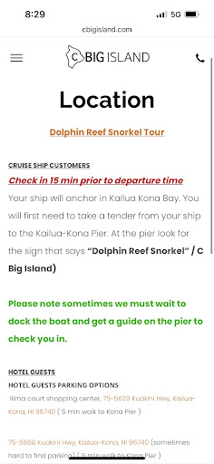 “CRUISE SHIP CUSTOMERS Check in 15 min prior to departure time Your ship will anchor in Kailua Kona Bay. You will first need to take a tender from your ship to the Kailua-Kona Pier. At the pier look for the sign that says "Dolphin Reef Snorkel" / C Big Island) Please note sometimes we must wait to dock the boat and get a guide on the pier to check you in.”