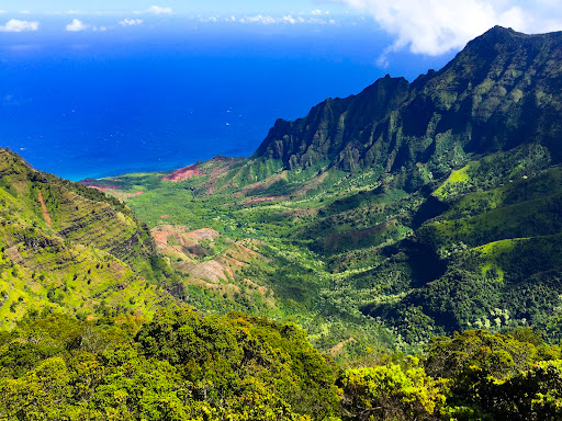 Kalalau Valley, carved into the heart of Kauai's Na Pali Coast, presents a breathtaking vista that stretches down to the azure expanse of the Pacific Ocean. Surrounded by towering, lush green cliffs, the valley unfolds in a tapestry of vibrant foliage, cascading waterfalls, and ancient, untouched landscapes. From this vantage point, the valley appears as a sanctuary, isolated from the world, where the only sounds are the whispers of the wind and the distant roar of the ocean. The panoramic view encompasses the vast, undulating sea, meeting the sky at the horizon, a spectacle of nature's grandeur and beauty, inviting...