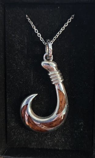 I had been looking for either a necklace, bracelet, or ring to take home as a gift for my husband. None of the stores I went to had what I was looking for. Actually I wasn't sure exactly what I was looking for but I would know it when I saw it. Stumbled on the Kona Jewelry Factory and as soon as my mom and I walked in we were warmly greeted by Kathy. She welcomed us, explained the pieces in the area I was looking at, and invited us to pick up any of the displays to turn them over for the price or if we weren't comfortable she would happily do it for us. I had heard so many stories of places that scolded you for touching items so this was refreshing to hear. I settled on a necklace with a fishhook pendant. Kathy shined up the pendant for me so it sparkled, upgraded the chain, and gave me a cute little gift box. While doing all of this we had some great conversation and laughs. Kathy is very sweet and it was such a pleasure doing business with her. I felt the prices were well in line for the merchandise and definitely better than anywhere else I had been. The chain is sterling silver, well made, and has a good weight to it. The pendant is heavy, good quality, and beautiful. Very pleased with...