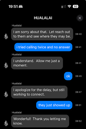 Ask your own driver whether he arrived late — he apologized when he got there and blamed the detour. I've also attached a chat with the Four Seasons, with a timestamp of me confirming when he arrived. In terms of being in the right place: We spoke with the Kahalu'u Bay Surf Shop at 8:30am, who said your van hadn't arrived yet, and confirmed we should wait at the stairs (which we did) until they arrived. They arrived at 8:51am, so 21 minutes late to be specific.