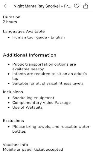 Response to owner: I appreciate your reply. Just to clarify my concern, the voucher I booked under listed a â2-hour durationâ with snorkeling equipment, video, and wetsuits included. While I understand that not all of this time is spent in the water, the actual snorkeling portion of 30â40 minutes felt shorter than what was implied. Posting the voucher here so future guests know whatâs advertised vs....