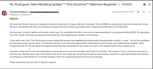 Update* I'm updating my review & adding a star, since original post. KL reached out to Chelsea after we posted our reviews. The first thing we made clear was that our online reviews are not for sale. It will not be deleted or modified & any negotiation & agreement on a refund was completely independent to the reviews. KL, C & I were in agreement. The bizarre conversation lasted about 1h, 20min. A I tried to keep it on the track of facts, figures, dates of payment & inconsistency in communication follow up & the timeline of pandemic-related restrictions in HI. KL was all over the place, from repeating a 'food credit for a future date' & ramblings about how hard the pandemic has been for her. Not for her family, business or clients. HER. I tried to connect the timeline of HI COVID19 restrictions with the dates that KL received payments for this future event. I explained that it was confusing that she was the paid consultant re: destination wedding location, yet she never once mentioned these updates to C. The conversation never stayed on track to facts & figures. It was frustrating. KL went back and forth with landing on an actual refund amount. She settled on $3K. OG made $2500 for the creation of the proposal & a few conversations. KL repeatedly said that she didn't recall many of the facts of our 'file' even at the time of this last phone call. She said that they lost money turning "so many" jobs away in place of our event (even though it was officially canceled in Sept)...which is pretty strange since few groups were gathering in mid-Dec in the US/HI, due to a PANDEMIC. Pretty good gig if you can get it. ⚠️ Original Review, 1 Star: Outrageous Scam. Katherine Louie Stole $5500 From Us. Ghosted Us. My daughter & fiance were planning their wedding in HI for Dec, 20. They chose to work with KL/OG because their priority was for fabulous food experience and KL's reputation qualified her for the job. The fact that she not only provided the food but also could be the event planner was a Win-Win. That & KL's positive reviews about her "great communication", they were happy to work with KL/OG. Their trust in her showed as they gave her a $5500 deposit, far in advance of the wedding date. It was going to be held at an ABNB with less than 30 people. Katherine sent them a detailed proposal. As 2020 progressed with a Pandemic, the wedding details were evolving. Each time C and KL communicated, C felt like KL wasn't listening. Chelsea specifically referred to KL/OG detailed proposal & mentioned that much of it wasn't necessary or needed as the wedding event was getting smaller & smaller due to HI Pandemic gathering rules. There also was ZERO written follow up with each of the changes that they "discussed" after each wedding-update call. After witnessing one of these circular non-follow up phone conversations between C & KL, I asked her to let me help her navigate the wedding details. I told her that KL is probably also overwhelmed with her cancelled events & business issues with the Pandemic. I gave her the benefit of the doubt & decided to clearly edit her proposal. This way, she could clearly see the changes & everyone could move forward. By 9/20, the wedding had turned into a small family gathering. I understood that KL/OG business was suffering as well, from the Pandemic. I generously edited the proposal & negotiated that she keep enough of the $5500 to compensate her for her time, $100 per hour, and the small meal & necessities for 10 people. (images) The result? Katherine Louie hasn't RESPONDED via email or phone AT ALL. She provided ZERO service for the $5500. Chelsea has continued to email & ask for the money back, & filled her in on her health issues, March, 2021. She didn't tell KL this for sympathy. She told her as an explanation & to appeal to her as as a trustworthy businesswoman. She reminded her why she really was relying on KL/OG reputation to plan her wedding & be responsive to her requests AND NOT SCAM HER. We're filing a complaint with the BBB and FDIC. This vendor, OG, took the money, no...