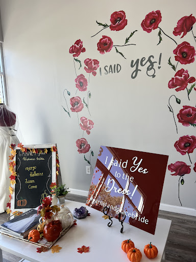 First, the location is easy to find. Their website notes limited parking, but I found there to be plenty. When I walked in, we were warmly greeted by one of the employee stylists and she informed me my stylist was just wrapping up with another client and it wouldn't be too long of a wait. No problem at all. I walked around and checked out the dresses and decor and found everything to be lovely and inviting. I noticed a cute fall-themed chalkboard sign at the front that welcomed all the brides with appointments that day, with our names handwritten; It was a pleasant surprise and I thought that was a sweet, personalized touch.