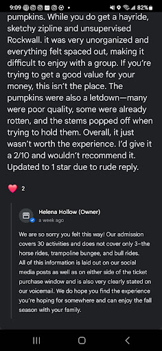 Read morePlenty of fun for the kids if you have an unlimited amount of money. You pay 17.50 for adults and children to get in, they would only do a military discount on my husband's ticket though he was paying for the whole thing. Once you pay to get in, you have to pay more for some of the rides and activities. No water fountains, and waters and drinks were 2-6 each. Highly recommend bringing your own food/drink. No staff to run the activities. There were kids(some with no parents) and parents all over the the course so children couldn't properly run it. There weren't enough Frisbees for more than one family to play disc golf at a time. Way under staffed for the size of the event and way overpriced, 10 dollars for each activity per child for what the bracelet band does not cover. When I was getting off the hay ride, my foot fell through the floor of the trailer because the wood was rotten. They also have signs posted everywhere stating they are not responsible for injury, sickness, ect from the activities they provide but don't have anyone out there to control activities nor do they make you sign anything entering the event or warn you of anything before you pay. The only thing decently priced were the $4 pumpkins. And I hope they don't try to comment some bull to my review, I've seen the responses to other reviews and they are pretty rude, and that made me change my 3 star...