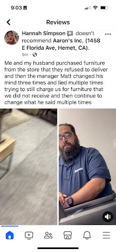 I have a couple family members and friends who were also interested in Aaronâs but this would be their store as well if they ordered. So I will let them know Iâll be looking elsewhere due to my horrible experience here in Hemet.